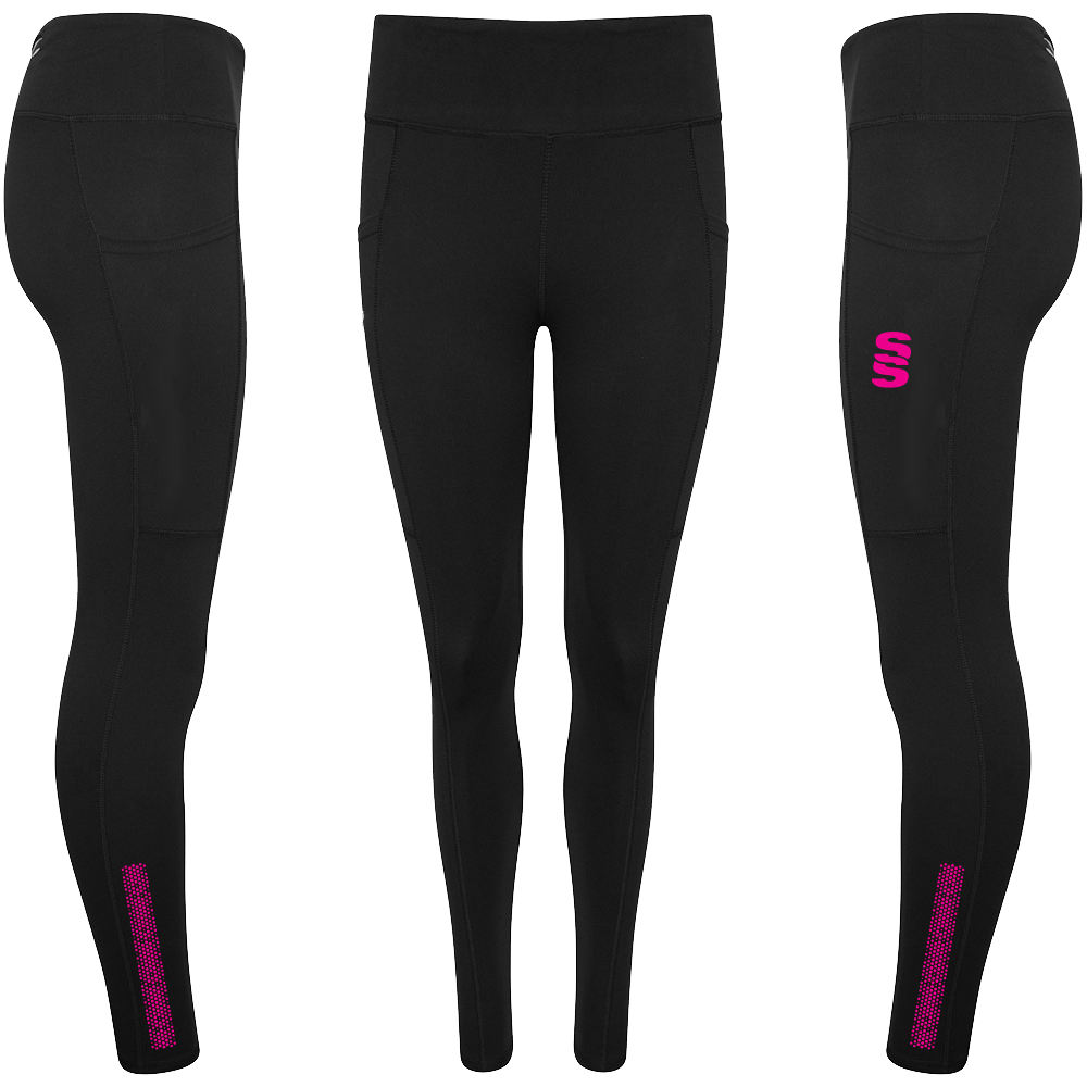 The Performance Full Length Leggings are made of fantastic, comfortable quality  85% Polyester and 15% Elastane. There no grinding on the material when stretched. They feature two side pockets for mobile phones and two smaller pockets (one with zip) for personal belongings, with an inner pocket for a key. To finish, a printed Surridge SS logo is situated on the left thigh.